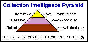 Using web search engines to find web pages related to your topic should be a part of any problem solving activity. However, think strategically when you do research, especially web based research. There are many different kinds of web search systems, some better for different purposes than others. So, prioritize your web page search engines. Always begin with the search system whose method of organization delivers the greatest amount of human intelligence. How? The pyramid shaped chart above left provides a first understanding of some of the web search systems.