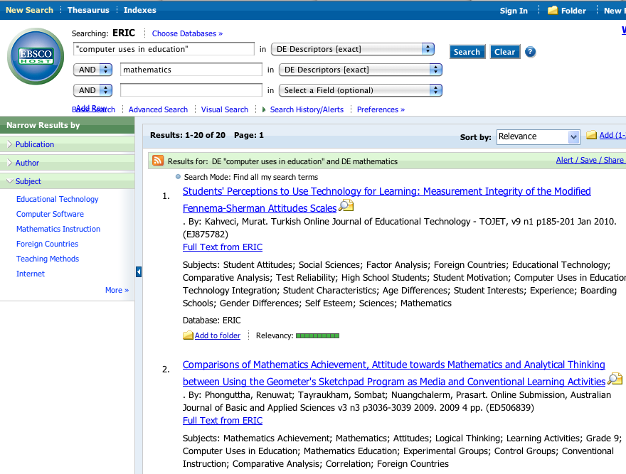 The table above is to help get you started; your table will be longer. Be thorough in making these two lists. They represent key vocabulary for returning in the future to the same topics for the latest findings, a powerful concept important to you throughout an educational career. As articles of interest are found, study the ERIC descriptors for a given article to find new descriptors not noticed when using the thesaurus. Each citation used in the bibliography must include at least one term from each list or column but it is not necessary to have actually done a search using all the terms in your list and all their possible combinations. That might take a lifetime. Though ERIC does not put quotation marks around phrases in the thesaurus, it is essential to do so when entering descriptors for a search.