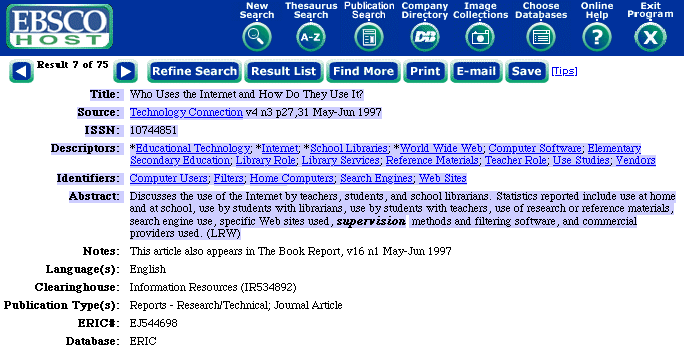 Kadel, Robert (Apr 2005). Desperately Seeking ERIC. Leaders Sharing--Research Windows. Learning and Leading with Technology, 32(7), 30-32 . (EJ697344, full-text online).