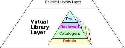 Degree of Human JudgmentThis bottom layer of the Look pyramid, the virtual layer, can also be organized as a collection of prioritized tools for searching. In this case, the priority is based on the degree of human judgment involved in the editing or refereeing of the stored information.The Virtual Library Pyramid: The Things Layer puts the Pro level at the top to represent the best view. It should also be noted that the top section takes up less space than any other part of the pyramid just as the percentage of Pro level materials is smaller than any other layer of Internet data. The Pro level represents full-text commercially published electronic files. Because of the higher level of human judgment involved in the commercial publishing process, these works generally provide the highest level of human judgment to the the files found on the Internet. There are three additional levels. The links at the Reviewed section of the virtual pyramid let you search databases of the most highly reviewed and qualified web pages. The Catalogers section of search tools shows those sites that do less reviewing but a great deal of advanced organizing into categories. The Robot section of the virtual pyramid takes you to links that do no reviewing or qualifying of what they put in their databases. Generally, the biggest databases are at the bottom of the Internet pyramid and the smallest at the top. But one of the points of the virtual pyramid is that a bigger quantity is not necessarily better. This pyramid suggests a general search strategy for problem solvers trying to find information. Start at the top of the virtual libray pyramid. Work from the highest levels of evaluation to the lowest. First use those search systems that have included the greatest degree of human judgment. For example, use the refereed indexes before you use a cataloger search tool. If you find what you need through tools at the top of the virtual pyramid, you have saved significant time and energy. If your search at higher levels of the pyramid comes up empty, move down the levels, through the subject catalogers, and eventually to the robot based systems with the fastest procedures for adding information. Do not interpret this to mean that the robot based systems are bad or poorly designed. To the contrary, they are fast and comprehensive. But they require much more work on your part in sifting out the most valuable items. Effective searchers must learn to maximize the features of the entire range of systems. For example, automated database construction through software robots builds enormous indexes or databases quickly. It is perhaps the only strategy that can almost keep up with the dramatic growth and change rates of the Internet. When you search these robot or automated indexes, search software puts the most relevant items at the top of your list by using formulas, such as counting the number of times your search terms appear in a web page. This strategy maximizes finding some quantity of information, of getting your hands on the needle in the haystack. The strategy however crumbles in attacking a topic for which massive amounts of information are already available on the Internet. A simple single word search might return 10,000 needles, that is references or links to web pages. Software robots can count word frequency and related tricks and put the sites or pages with the highest counts at the top of your returned list of sites. This helps. But the robots' statistical formulas are incapable of deeper analysis. They cannot rank pages based on higher values (e.g., the most accurate, easiest to use, or clearest writing style, etc.). Such higher filtering and rating systems take much longer to develop and cost much more in human time and resources. More costly development means that the most valuable refereed indexes may contain the fewest references and become the least current, depending on the economic resources of the reviewing or refereeing corporation. To apply significant amounts of qualified human intelligence is expensive. Consequently it seems reasonable to expect highly refereed indexes that are large and current will charge you at some point in their development or else go bankrupt and disappear. With any search system on this table above, information retrieved must be qualified. Your human judgment must be used to determine its truthfulness, relevance and its currency. |