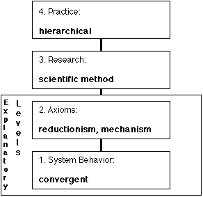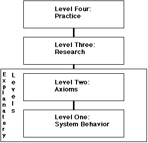 According to the fairy-tale, the success of science is the result of a subtle, but carefully balanced combination of inventiveness and control. Scientists have ideas. And they have special methods for improving ideas. The theories of science have passed the test of method. They give a better account of the world than ideas which have not passed the test.(Feyerabend, 1975, p.300) The above definitions are written with full awareness that there are further distinctions that can be made about the philosophy of science including logical positivism, operationalism, empiricism and more (Flannery 1988). However, it is felt that the ideas presented thus far are adequate introduction for the purposes of the arguments to be presented. The next figure sketches the industrial age paradigm. (See Figure 1-2.) At the highest level, level four, stands educational practice which is hierarchical in nature, deemed generally inadequate by numerous national reports and due for significant change. In addition, all the levels of this model can be seen as part of a hierarchy controlled from the explanatory level, and especially by level one.