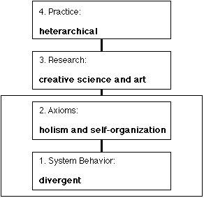 The equations are deterministic. Exactly the same inputs yield exact outcomes at all iterations, but miniscule differences may yield dramatically different outcomes. One commonly used metaphor is the idea of a stone poised at the top of a hill. The tiniest of deviations in the beginning shove or in shoves along the hill may produce very different results in the end. Prediction may be possible for some period of time, but given the nature of chaos and that there are different routes into chaos, even the length of this time is not predictable. The evidence that such aforementioned diverging behavior is integral to healthy systems gives support to the claim for a more advantageous account of systems in education. Specific examples of how biological and human physiological systems use chaotic dynamics as integral to their design not only raises the perspective of chaotic dynamics as a sign of health in living systems, (contrary to its effect in mechanical systems), but indicate that reliably repeatable phenomena may be a sign of disease (Pool, 1989; Rapp, 1985, 1987; Skarda & Freeman, 1987). Given this new perspective on determinism, and as holism and self-organization are not found wanting, only their indeterministic base, the alternative paradigm proposed here, is a wedding of these two axioms to the more rigorous view of divergent cause and effect espoused in modeling chaotic dynamics. The model in figure 1-3 briefly represents some of the basic ideas of the proposed chaotic dynamics paradigm. In general, in this paradigm, the emphasis in educational practice within level four shifts from hierarchy to heterarchy or to distributed bottom-up structures. For now, level three should be understood as a common meeting ground for new approaches to the educational research (theory and methods) that borrow from both creative (discovery) science (e.g.: Reason and Rowan, 1981; Romberg, 1987) and art (e.g.: Eisner, 1985), a level that generally denies the possibility of an objective version of Krathwohl's (1985) confirmation phase. The explanatory level two consists of the previously discussed axioms: holism, self-organization. The system level, level one, assumes divergent behavior over time, that is deterministic chaos.